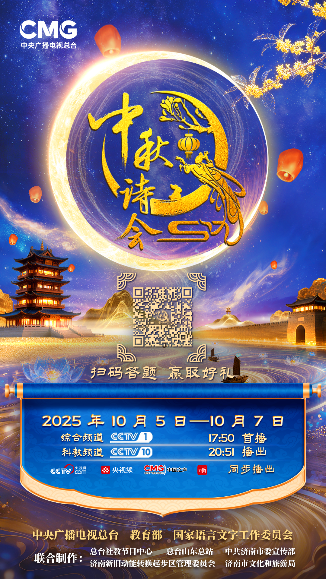 一轮明月照古今,七十二泉涌诗情。由中央广播电视总台、教育部、国家语言文字工作委员会共同主办的《2025中秋诗会》,将于10月5日至7日在央视综合频道(CCTV-1)、央视频、央视网17:50首播;科教频道(CCTV-10)20:51播出;中国之声、云听23:05播出。