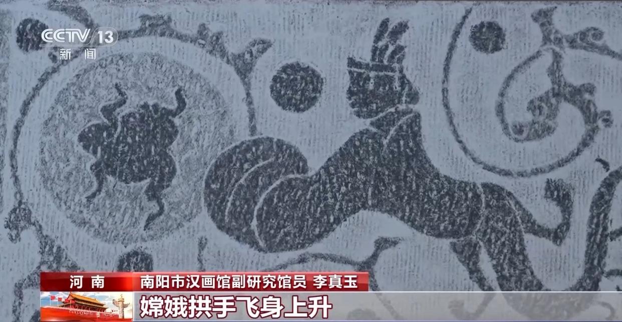 南阳市汉画馆副研究馆员 李真玉:这块画像石的左上方就是月亮,月亮里面刻画的是蟾蜍,蟾蜍是我们古代人对月亮里面的阴影和山脉的一种解释和臆想。嫦娥拱手飞身上升,人首蛇身是我们古代神话中好多神灵形象的一种表现,它反映了人们对自然的崇拜。九颗星宿和祥云代表了一种天空、吉祥的寓意。