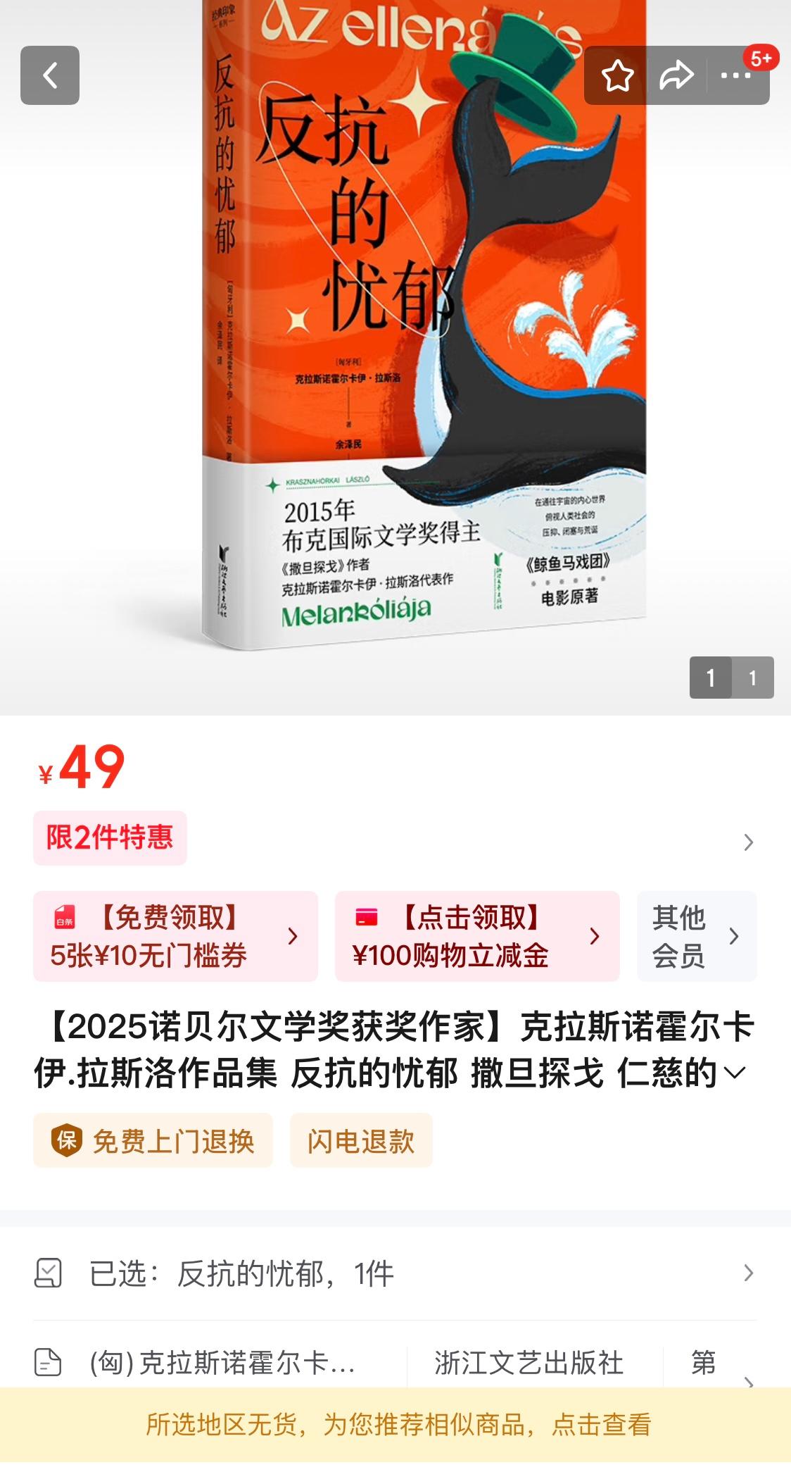 就在诺贝尔文学奖揭晓后不久,浙江文艺出版社的《反抗的忧郁》显示部分地区已无货。