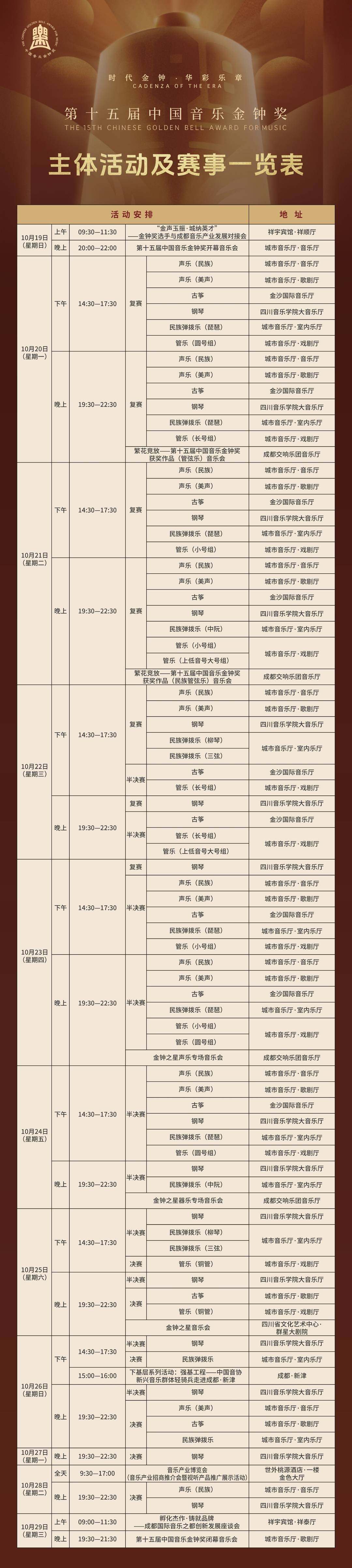 据悉,本届金钟奖以“时代金钟·华彩乐章”为主题,将在10月18日至29日期间开展80余场系列活动,包括开幕音乐会、闭幕音乐会、5场专场音乐会以及主体赛事等。