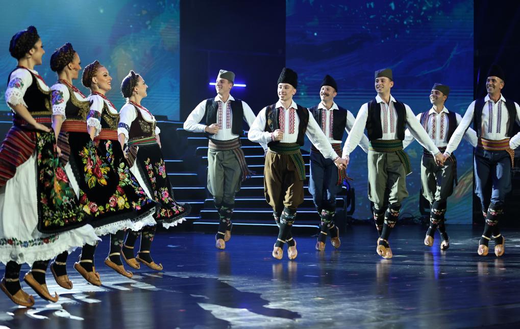 这是10月16日晚,塞尔维亚科洛民族歌舞团在第13届中国国际民间艺术节开幕式文艺晚会上,带来舞蹈《舒马迪亚舞蹈》。新华社记者黄国保 摄