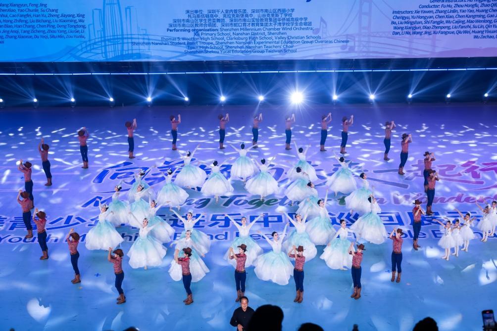 图为中国深圳千人室内管乐团、深圳市南山区西丽小学、托马斯伍顿高中、克拉克斯堡高中、山谷克里斯丁学校、深圳市南山区学生芭蕾舞团、深圳市南山区教师合唱团、深圳市蛇口育才教育集团太子湾学校学生合唱团共同演绎《最美和声》。