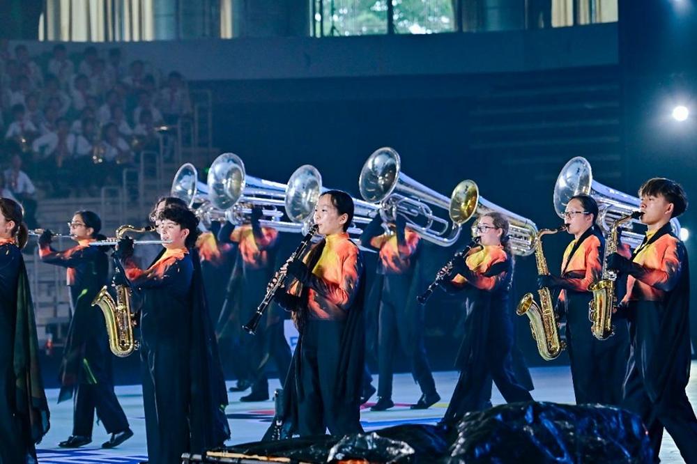 图为中国深圳市南山区西丽小学、深圳市南山区文理实验学校(集团)文理一小、深圳市南山实验教育集团华侨城高级中学、深圳市南山区第二外国语学校(集团)学府二小共同表演行进管乐《深圳奇迹》。