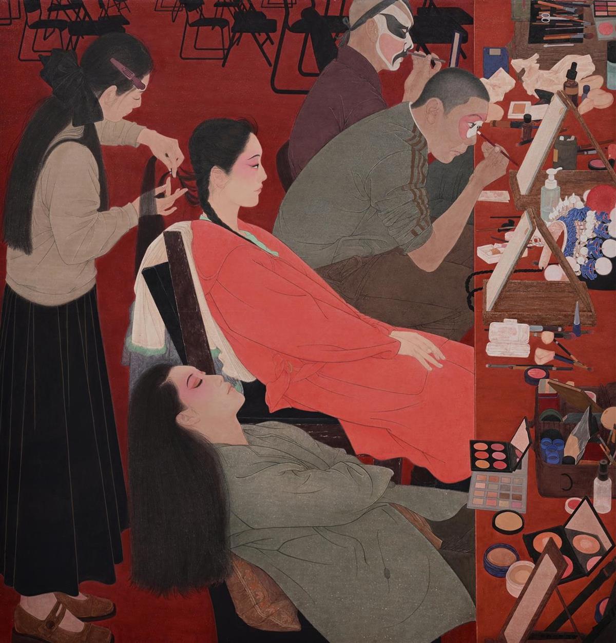 采用传统中国画的散点式构图和俯视的角度,人物形象偏写实风格,随意摆放的化妆道具加强了场景的生活感,高低错落的人物安排强调了动静的对比。