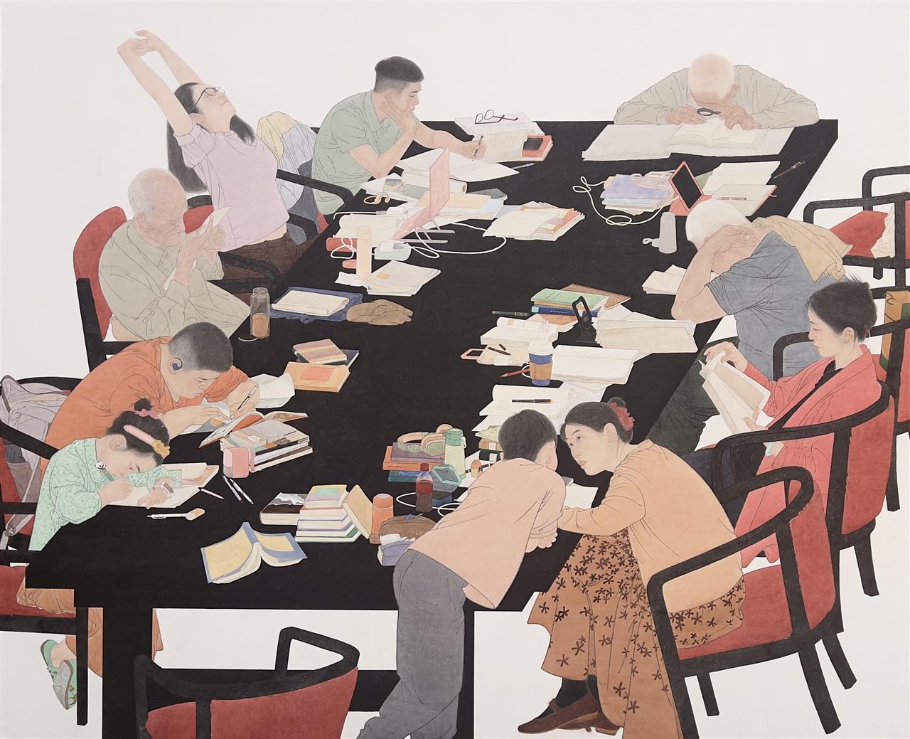 将日常学习场景融入画面中,不同年龄、身份的人物各安一隅,以小场景折射大主题,将“全民阅读”的风尚、“学习强国”的热潮与“文化自信”的底蕴相互融合。