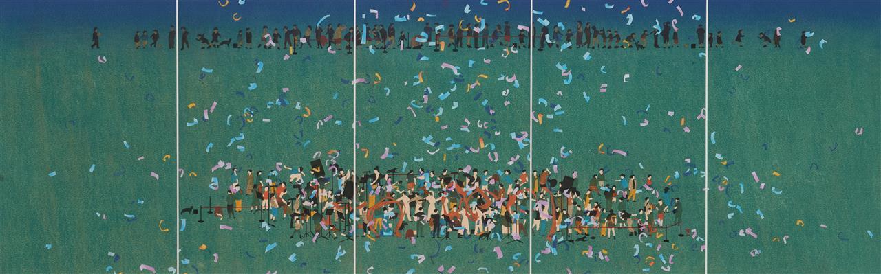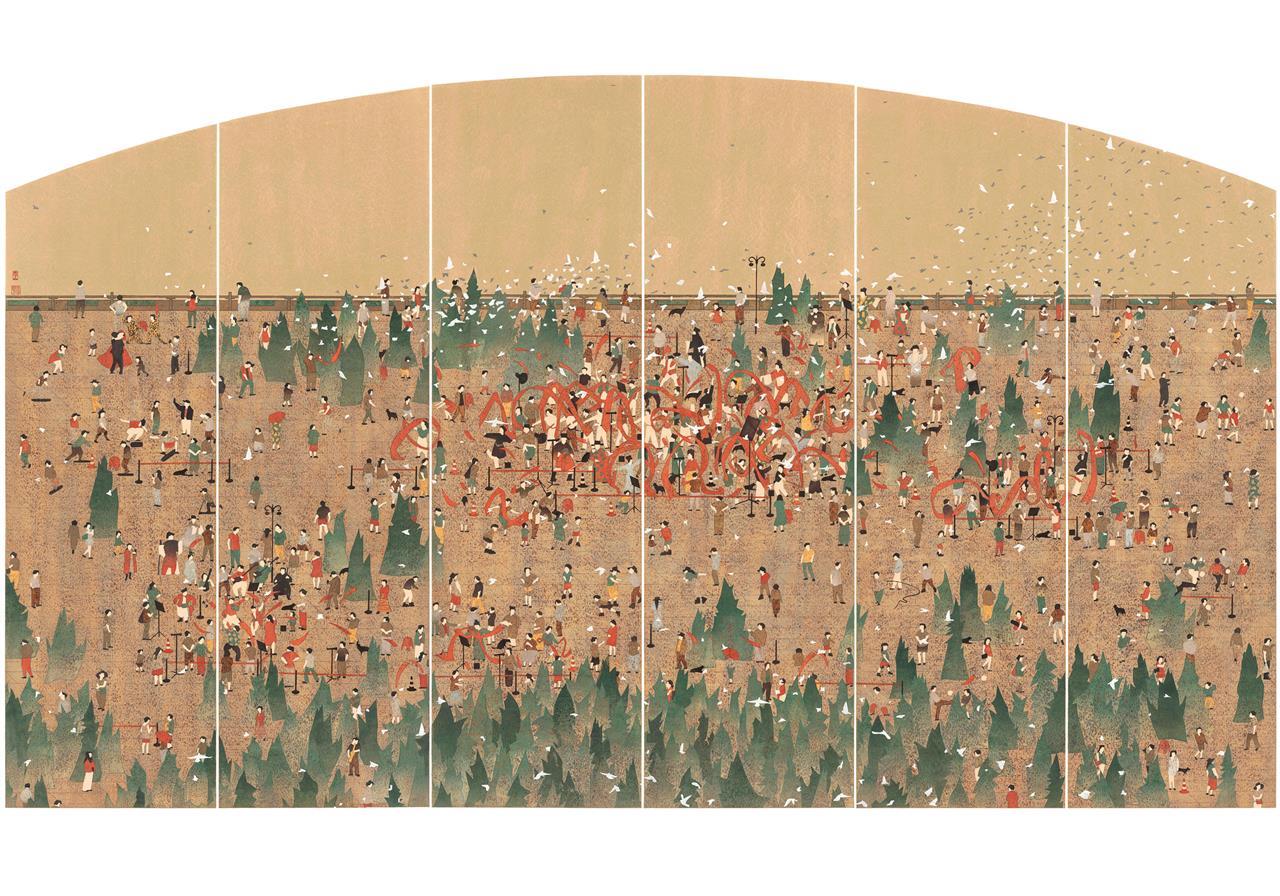 舞动的红绸经反复叠加,将盛世欢腾推向高潮,纷飞的彩带则渲染出喧嚣热烈的气氛。作品通过叠加的图式语言,精彩刻画出“大江大河大武汉”的城市风貌与人文风采。