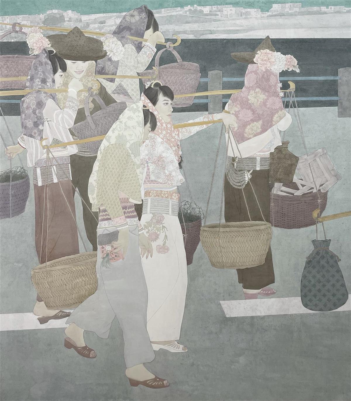以福建省泉州市惠安县惠东半岛海边的惠安女为题材,画面注重表现惠安女的服饰特色,同时注重展现整体色调中的和谐,以整体的感觉表现了人以及彼此之间的关系。