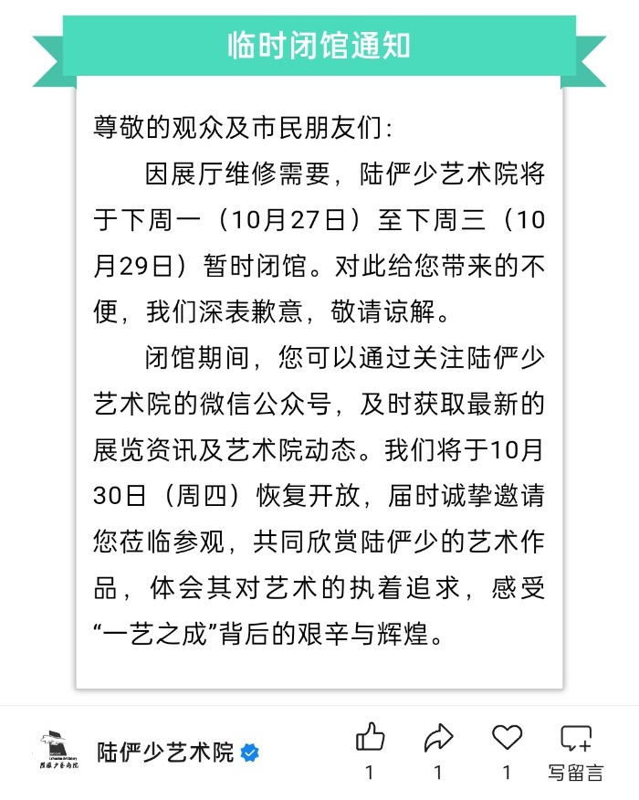 记者看到,10月23日下午,该艺术院官方微信公众号发布了《临时闭馆通知》,称因展厅维修需要,该艺术院将于下周一(10月27日)至下周三(10月29日)暂时闭馆。