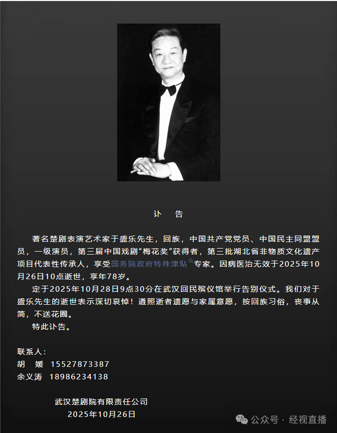 著名楚剧表演艺术家于盛乐先生,回族,中国共产党党员、中国民主同盟盟员,一级演员,第三届中国戏剧“梅花奖”获得者,第三批湖北省非物质文化遗产项目代表性传承人,享受国务院政府特殊津贴专家。因病医治无效于2025年10月26日10点逝世,享年78岁。