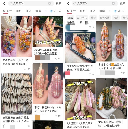 “一开始就是单纯觉得好看,买回来发现可以当包挂,衣服的配饰,拿在手上盘玩也很解压。”多次向朋友“安利”文玩玉米的宋女士在接受记者采访时表示,文玩玉米搭配黄金、串珠等配件具有“悦己”功效,“看着就美美的,心情都变好了。”