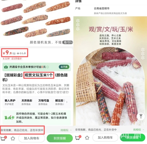 记者30日早间登录叮咚买菜App发现:部分门店9.9元的文玩玉米已销售一空,显示“商品已抢光,正在补货中”。这款近一年才被大众熟知的新兴文玩,市场价格也出现从几元到千元乃至上万元的价格悬殊。