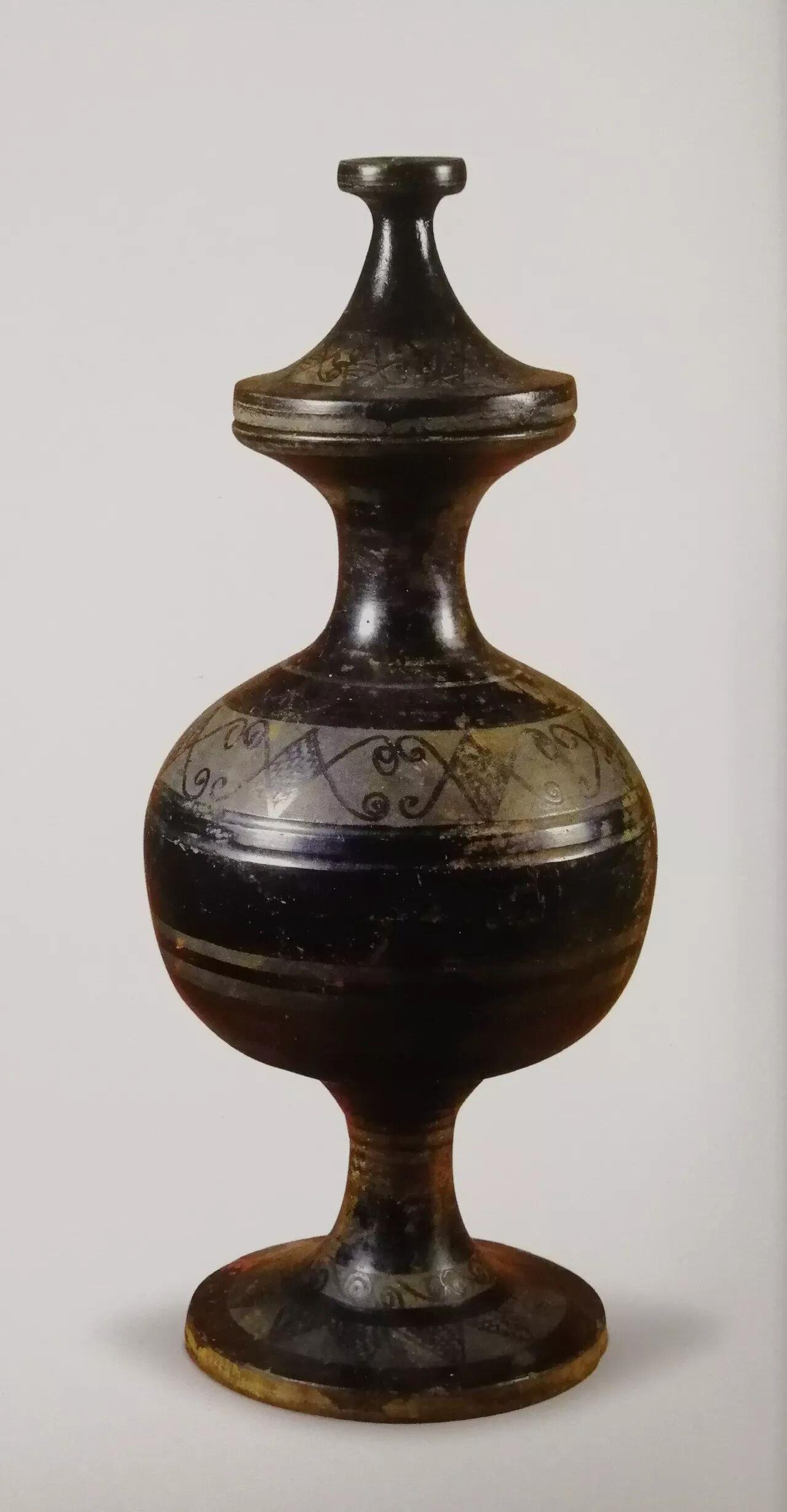 △战国 磨光压划纹黑陶球腹壶河北博物院展出 河北省文物考古研究院藏