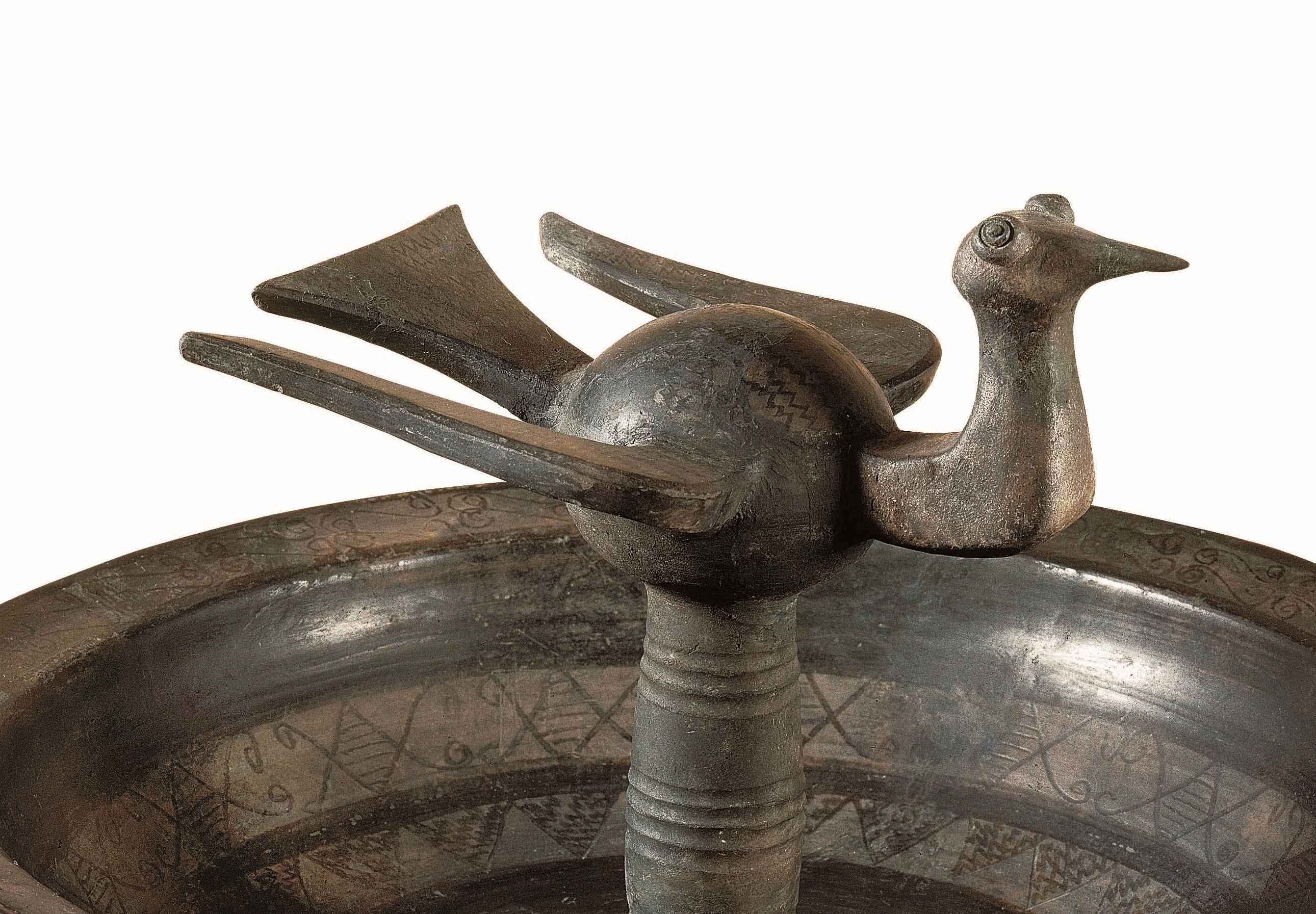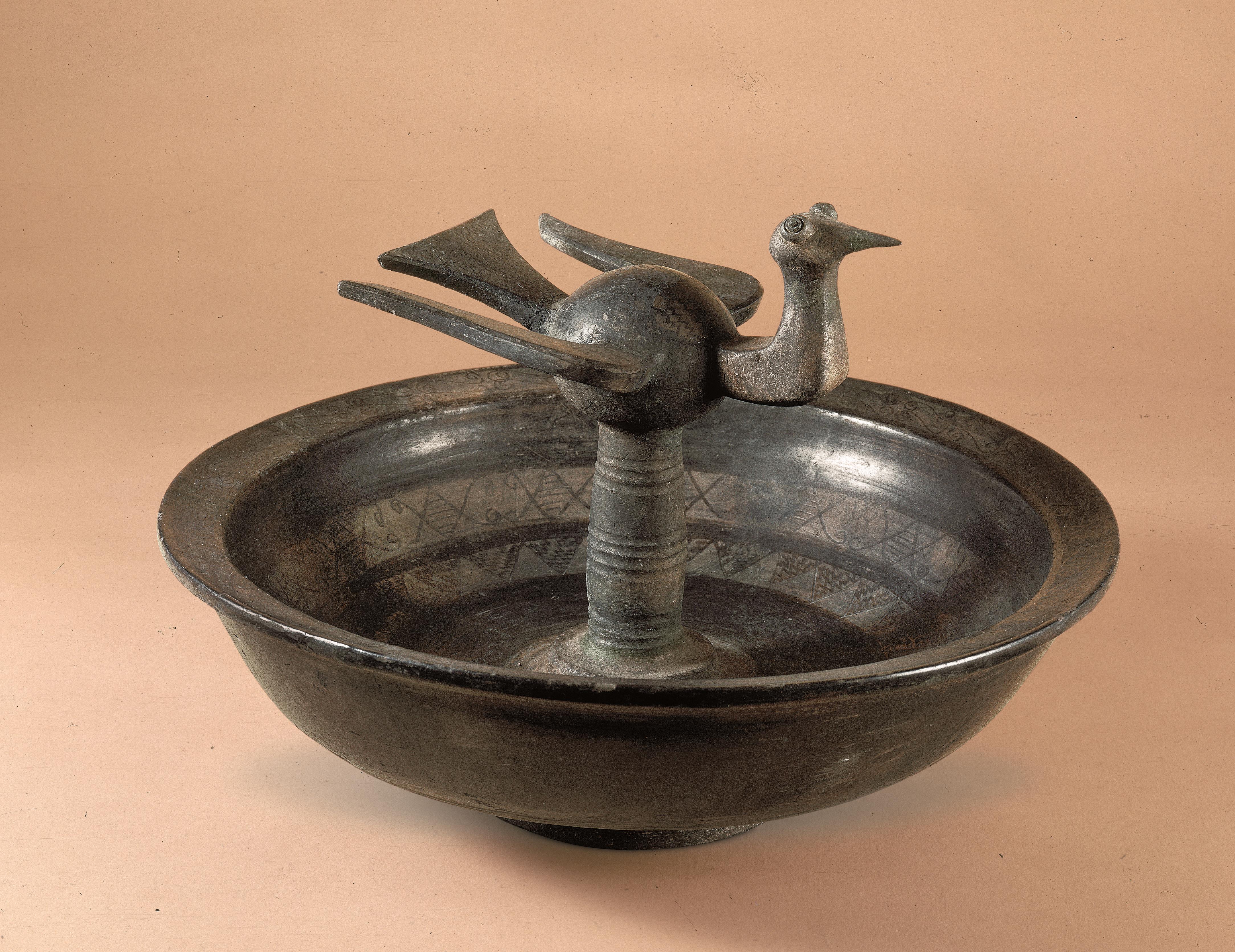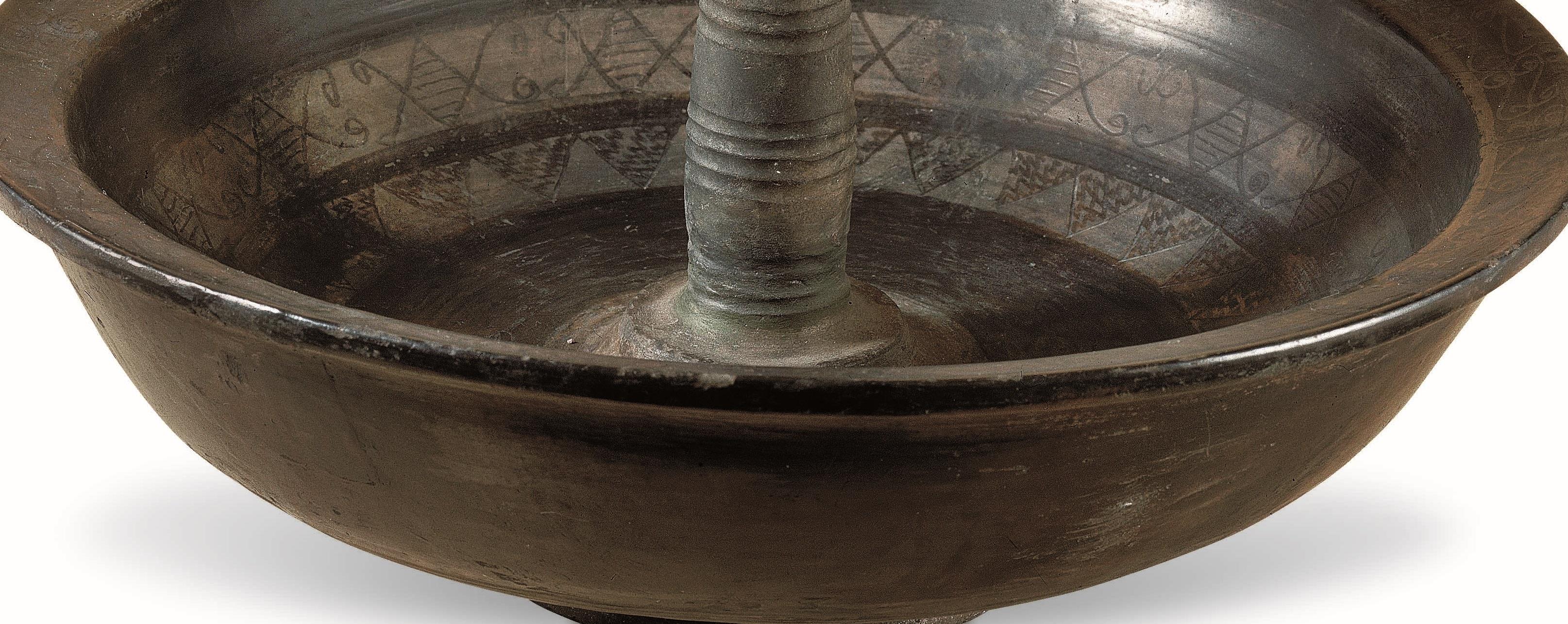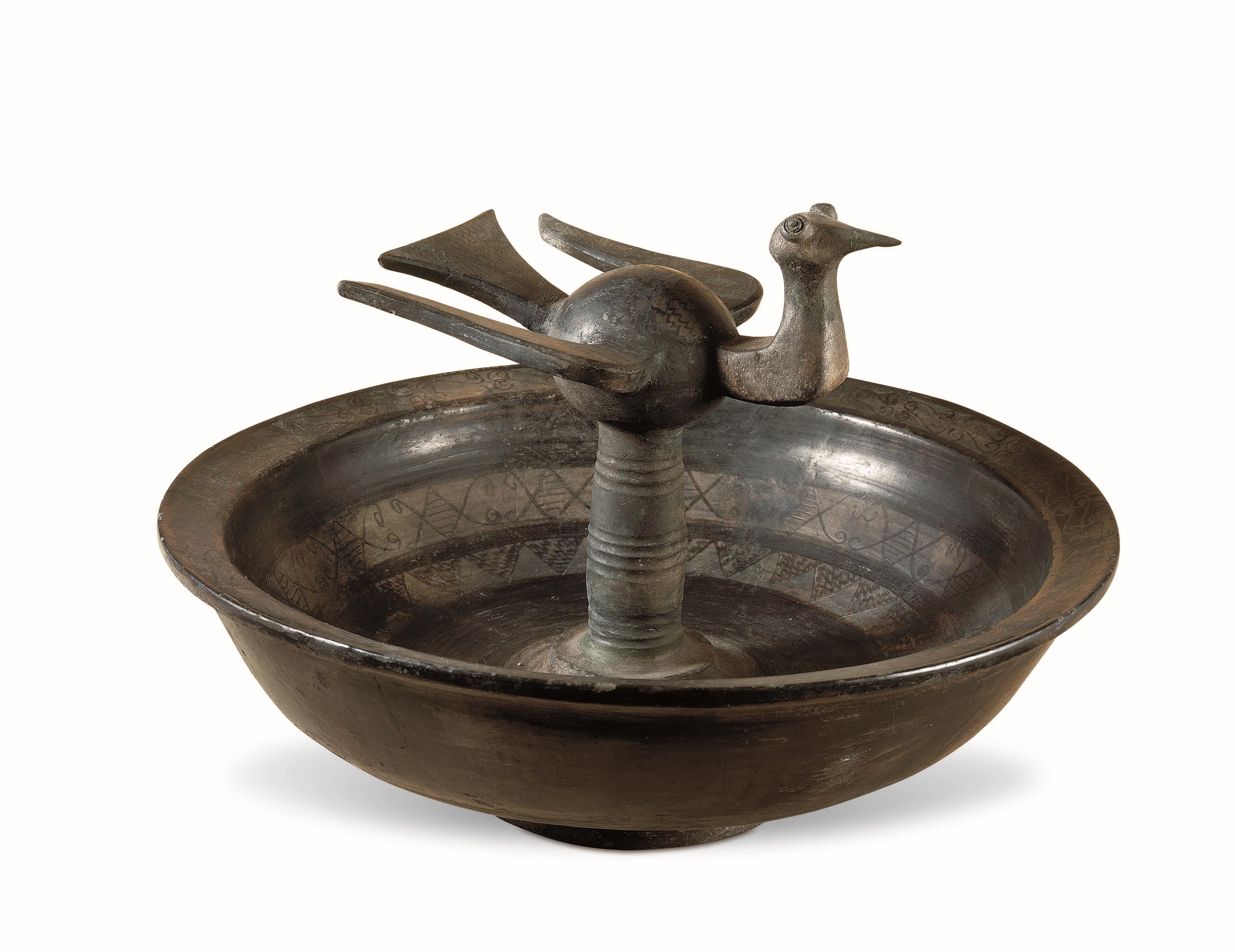 △战国 磨光压划纹黑陶鸟柱盘 河北博物院展出 河北省文物考古研究院藏