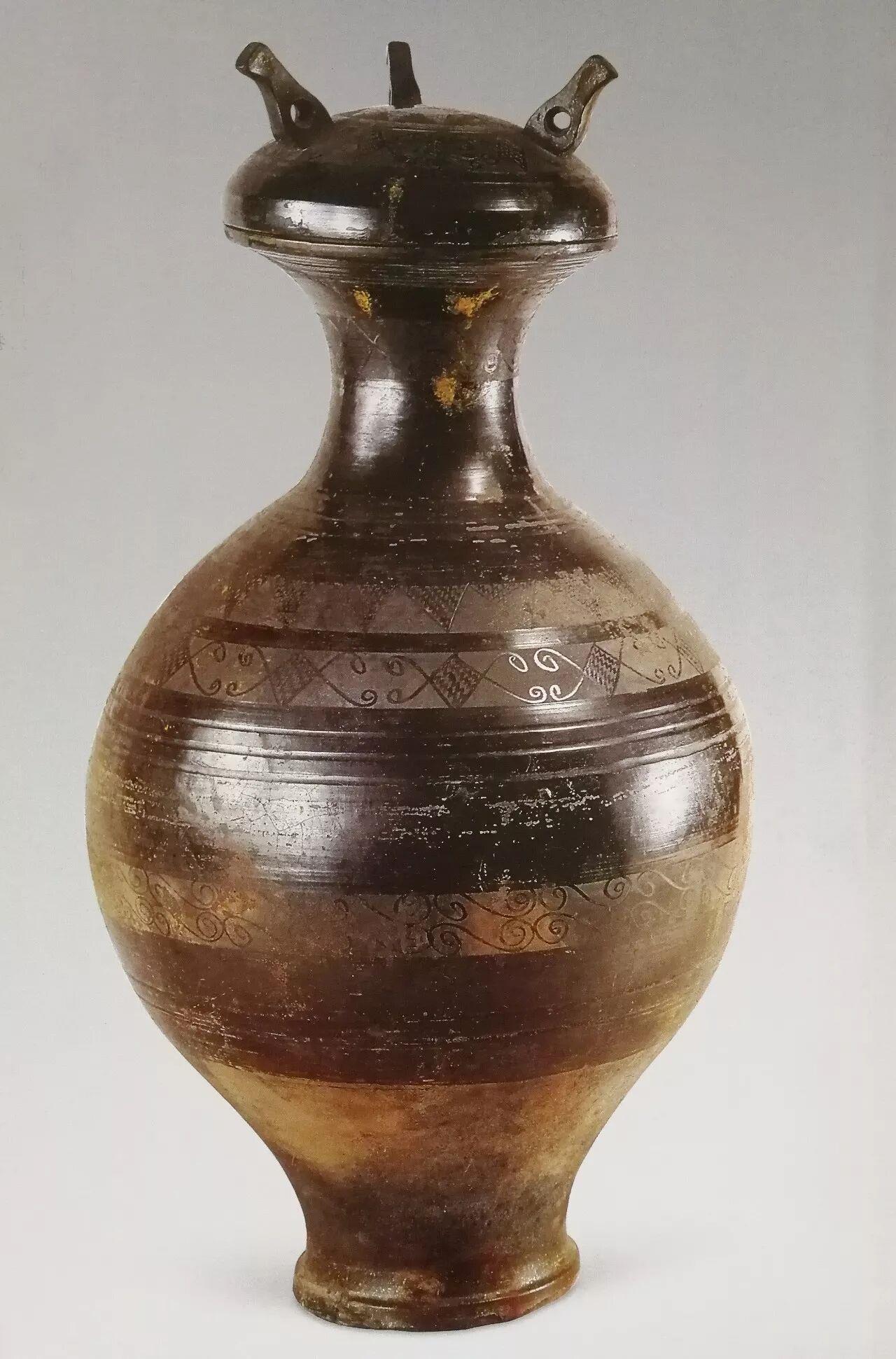 △战国磨光压划纹黑陶圆壶 河北博物院展出 河北省文物考古研究院藏
