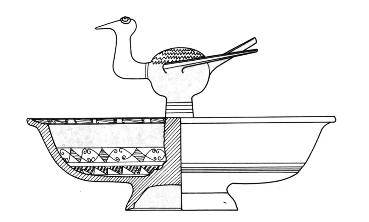 磨光压划纹黑陶鸟柱盘