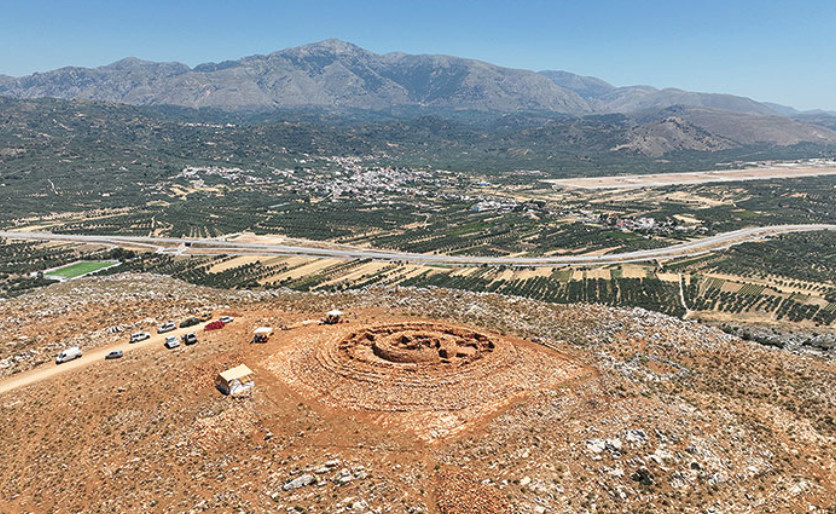 4.希腊著名的克里特岛上,在海拔约900米的帕普拉山顶,考古人员发掘出一座直径约50米的八重同心圆石墙建筑,中心为带有彩绘的四分穹顶结构。该建筑由青铜时代米诺斯文明(约公元前300~1100年)的先民建造,被认为是当时当地各族群的聚会与仪式举办中心,学者将其比喻为“史前欧盟”。