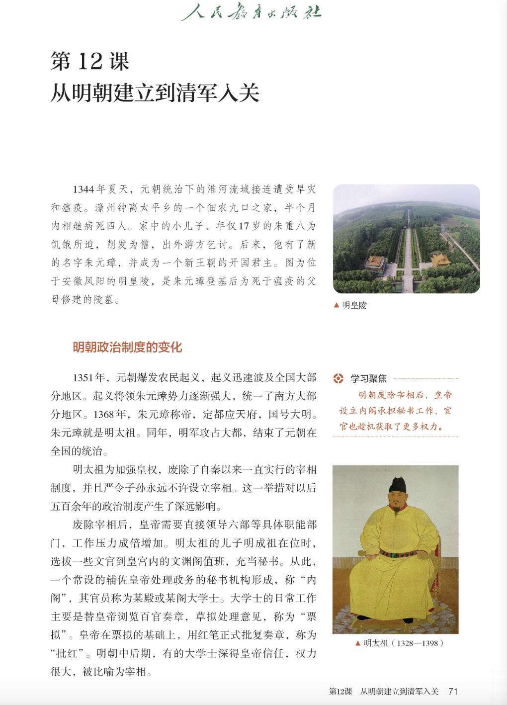 根据人民教育出版社官方网站上的教材电子版显示,2019年出版的普通高中教科书《中外历史纲要(上)》和2024年出版的初中历史教科书(七下)中朱元璋的肖像均进行了更换。