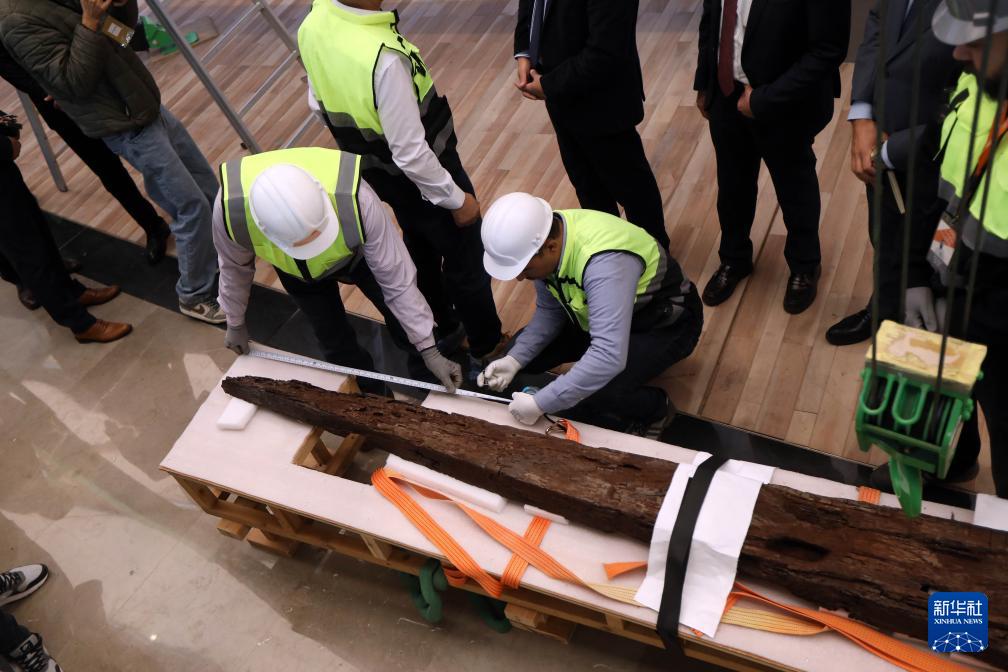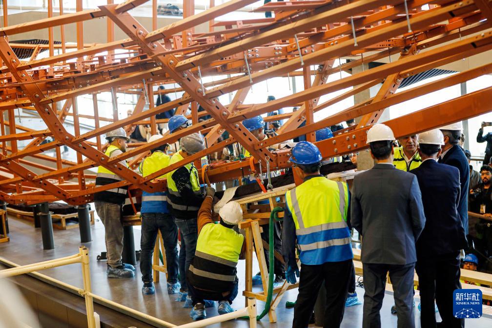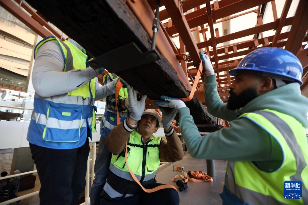 12月23日,在埃及吉萨的大埃及博物馆胡夫太阳船展厅内,埃及修复团队开展古埃及法老胡夫第二艘太阳船的组装工作。新华社发(艾哈迈德·戈马摄)