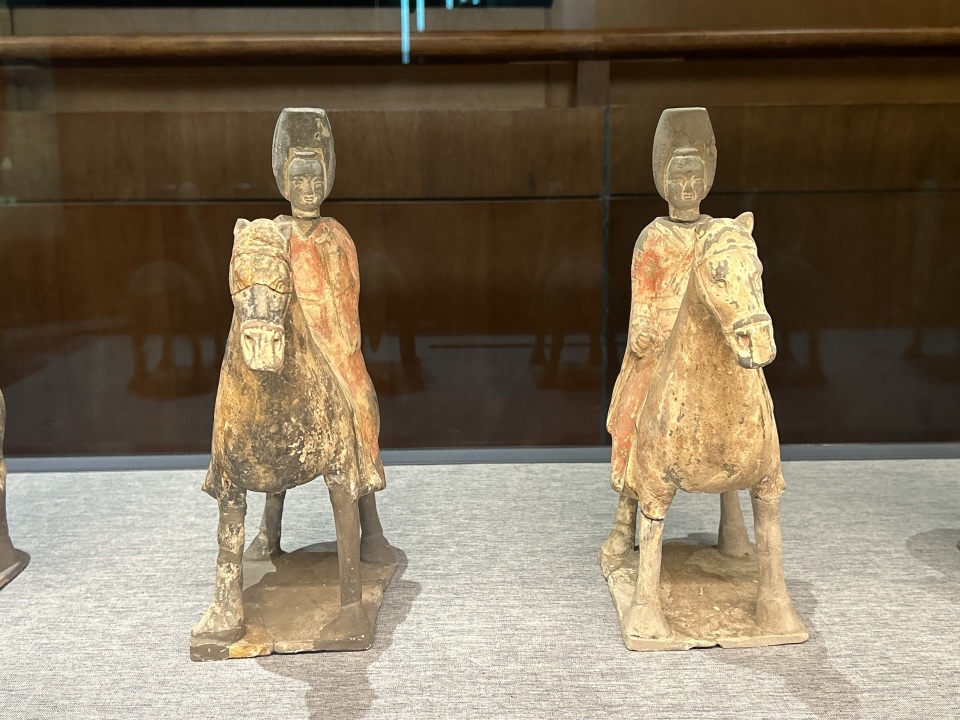 此次展出甲胄骑兵俑、风帽鼓乐骑俑、笼冠鼓乐骑俑等多组陶俑。展柜中,人俑骑乘骏马,或着铠甲手执武器,或头戴风帽手持乐器,活灵活现。“这些陶俑初看相似,细看各有千秋。每个人物的表情、动作,还有衣褶、马鞍这些细节,都有差异。”专家介绍,甲胄骑兵俑属于仪仗中的军卒,上身穿圆领窄袖衣,外罩甲胄,身后右侧斜背一箭囊,人物拳心的小孔里原来应该插有武器等物。鼓乐骑俑面部丰满,身穿交领右衽宽袖褶服,做各种演奏动作。
