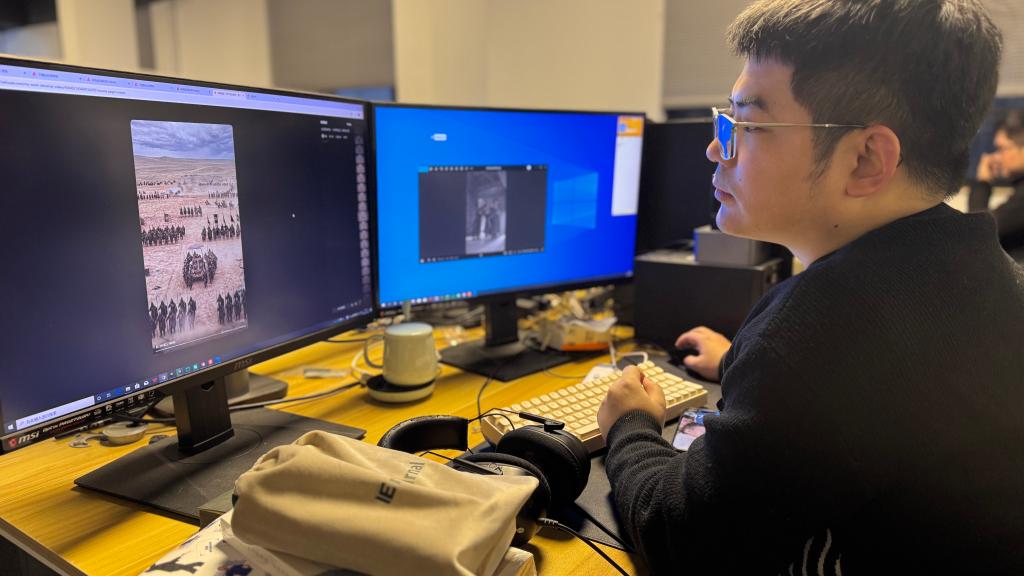 12月24日,横店一家影视公司后期制作工作室内,视觉人员正在借助AI进行短剧的后期制作。新华社记者段菁菁 摄