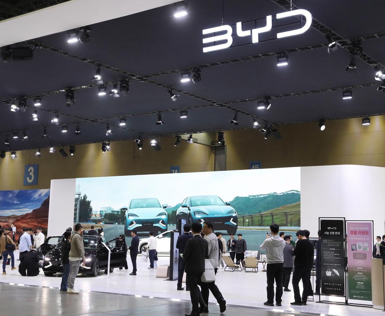 2025年4月8日,在韩国高阳举行的 “2025首尔移动出行展”上,观众参观中国品牌比亚迪展区。新华社记者 姚琪琳 摄