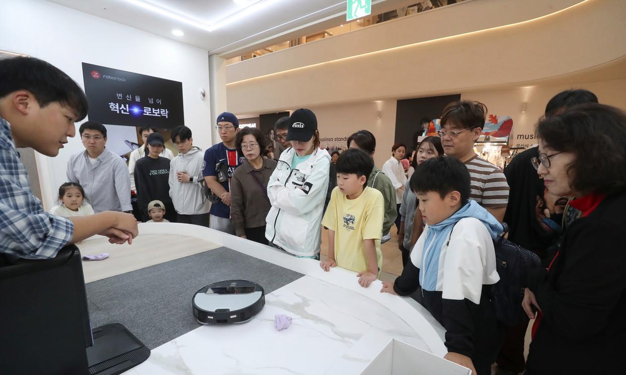 2025年10月12日,在韩国首尔近郊的一家大型购物中心,韩国消费者观看中国品牌扫地机器人演示。新华社记者 姚琪琳 摄