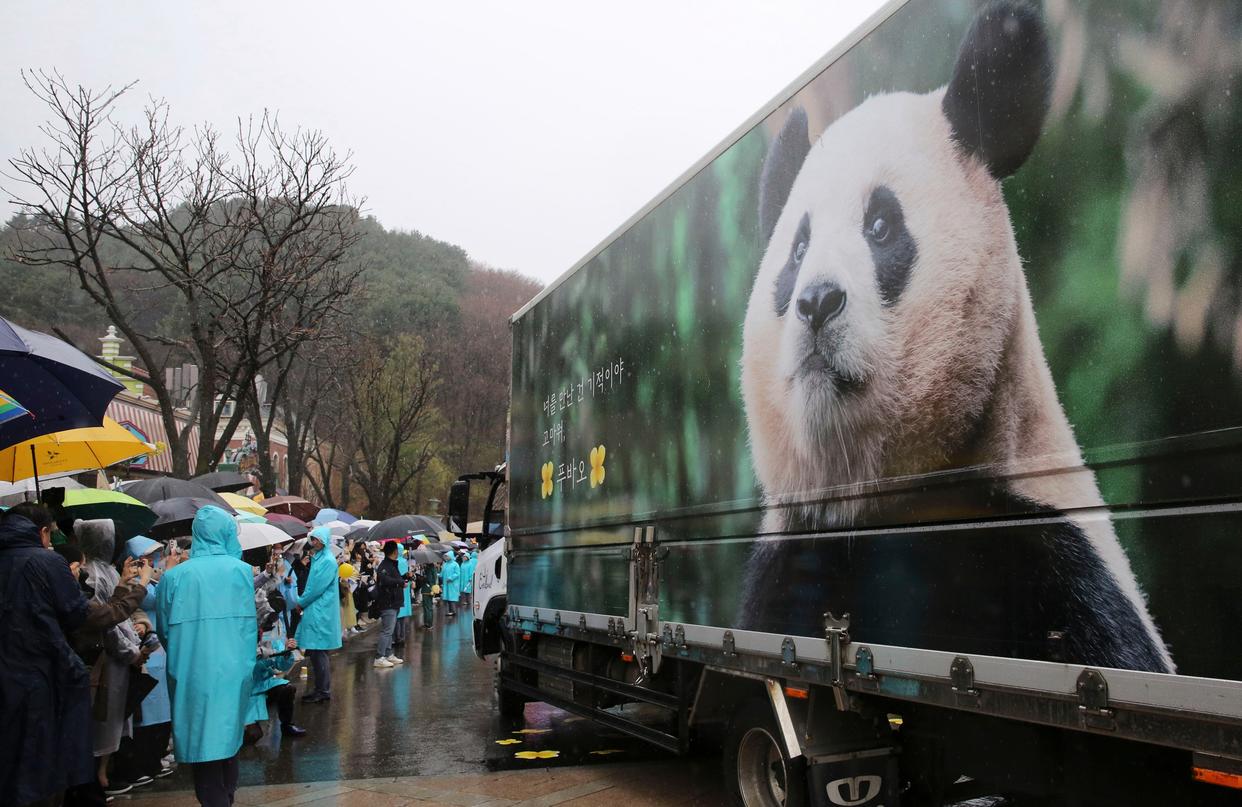 2024年4月3日,韩国民众在龙仁市的爱宝乐园雨中送别大熊猫“福宝”。当天旅韩大熊猫“福宝”启程回国。 新华社记者 姚琪琳 摄