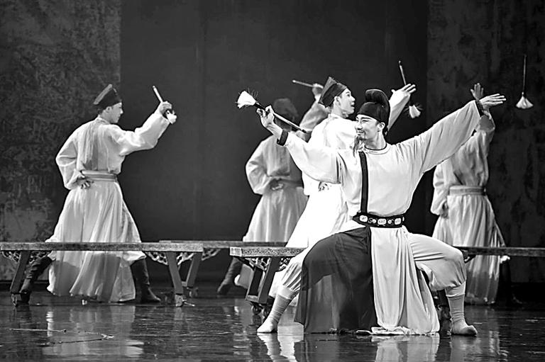 当代舞剧跨媒介创作还通过对视觉图像符号的动态转化、意象构建与诗化叙事,实现文学艺术作品的“IP再生”。如舞蹈诗剧《只此青绿——舞绘〈千里江山图〉》(简称《只此青绿》)。这部对宋代传世画作跨艺术门类创作的舞蹈诗剧,以极致的视觉化“修饰”戏剧性,使静态山水画面呈现出动态的交响节奏,充分发挥舞蹈作为动态造型艺术的媒介特质与视觉效应。《只此青绿》以“诗剧”为体裁,以“展卷、问篆、唱丝、寻石、习笔、淬墨、入画”等篇章为纲目,体现出诗歌体戏剧叙事的特点,既带有浓烈的诗情、诗意,也有着戏剧的情节、场面。浪漫的诗性和抒情性,给予观众广阔、丰富的视觉意象与想象空间,凸显“舞绘”之本义、彰显舞蹈之魅力。又如分别以“天下第一行书”《兰亭集序》、“天下第二行书”《祭侄文稿》为题材创作的舞剧《永和九年——兰亭集序舞传》和《颜真卿》,用舞蹈的身体之动呈现书法的筋骨之美,让观众看见文字背后的情感、哲思与文化气度,是当下创作者有意识挖掘传统文化中的典型人物的体现。