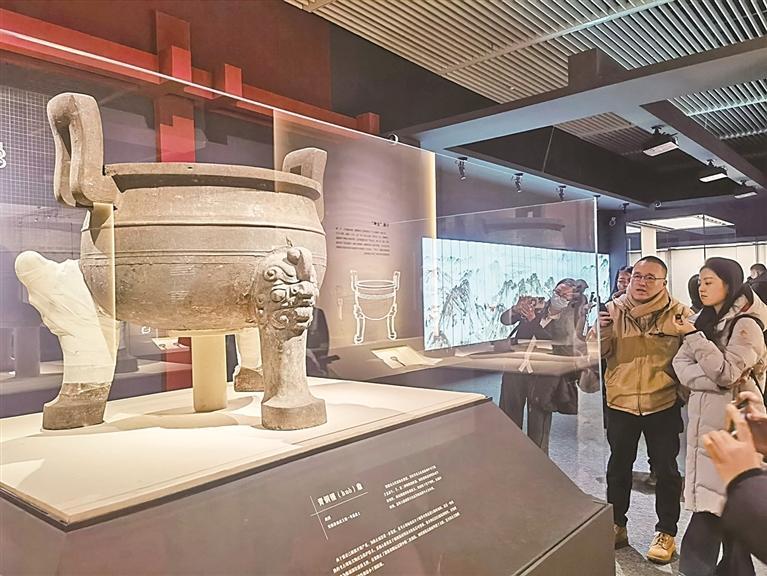 在现场,一件缠着“绷带”的青铜镬鼎吸引众多目光。这件青铜镬鼎的两只“脚”都被缠上了绷带。难道是“骨折”了?记者带着好奇凑近展牌,原来是因为鼎足已破损开裂严重,为防止病害进一步发展,考古人员用高分子绷带对鼎足进行临时加固。这是一种成熟的考古现场文物应急保护技术,可以在短时间内为脆弱部位提供支撑,有效防止提取和搬运过程中的二次损伤,同时固化后的材料便于去除,完全符合文物保护所要求的可逆性和最小干预原则。