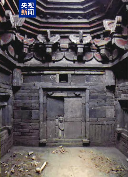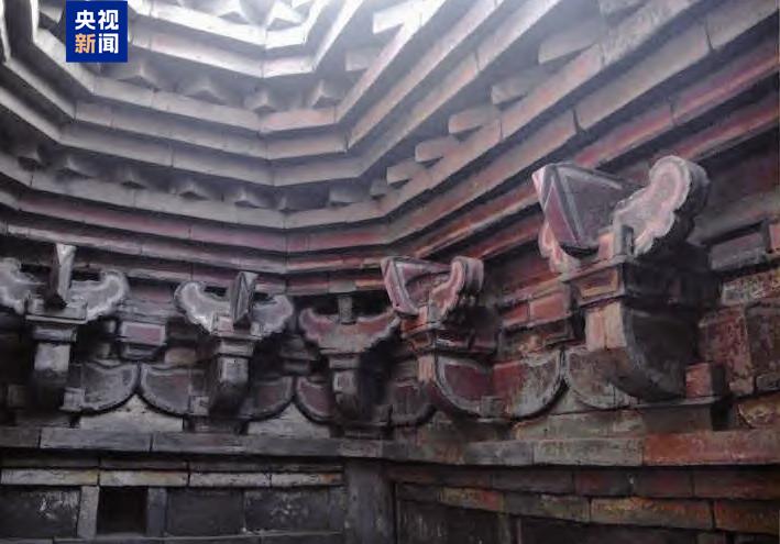墓室内靠北用方砖铺砌一棺床,由6排半方砖铺成,每排5块半方砖,方砖十字对缝平铺,四边辅以条砖。墓室正面北壁砌有格扇门,门右半侧微启,一妇女身着长裙套衫,双手笼袖,面庞丰满,头挽髻,恭谦站立,微笑着面对墓中。东西两壁各砌雕有对称的两扇四抹头格扇和破子棂窗。东、西两侧壁靠近假门两侧各砌筑一破子棂窗。墓室四壁顺砖错缝平砌,四角向内逐渐叠涩。在四壁及转角处施有14朵砖雕彩绘四铺作斗栱。在斗栱之上第五层、第九层、第十二层设菱角牙子一周,逐层内收至墓顶,构成八角叠涩攒尖顶墓葬。顶部成方形口,最后以条砖压茬覆口。