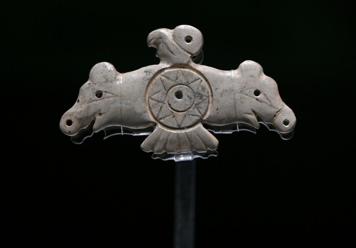 这是凌家滩遗址博物馆展出的玉鹰(2025年5月16日摄)。玉鹰胸腹刻有大小两圆