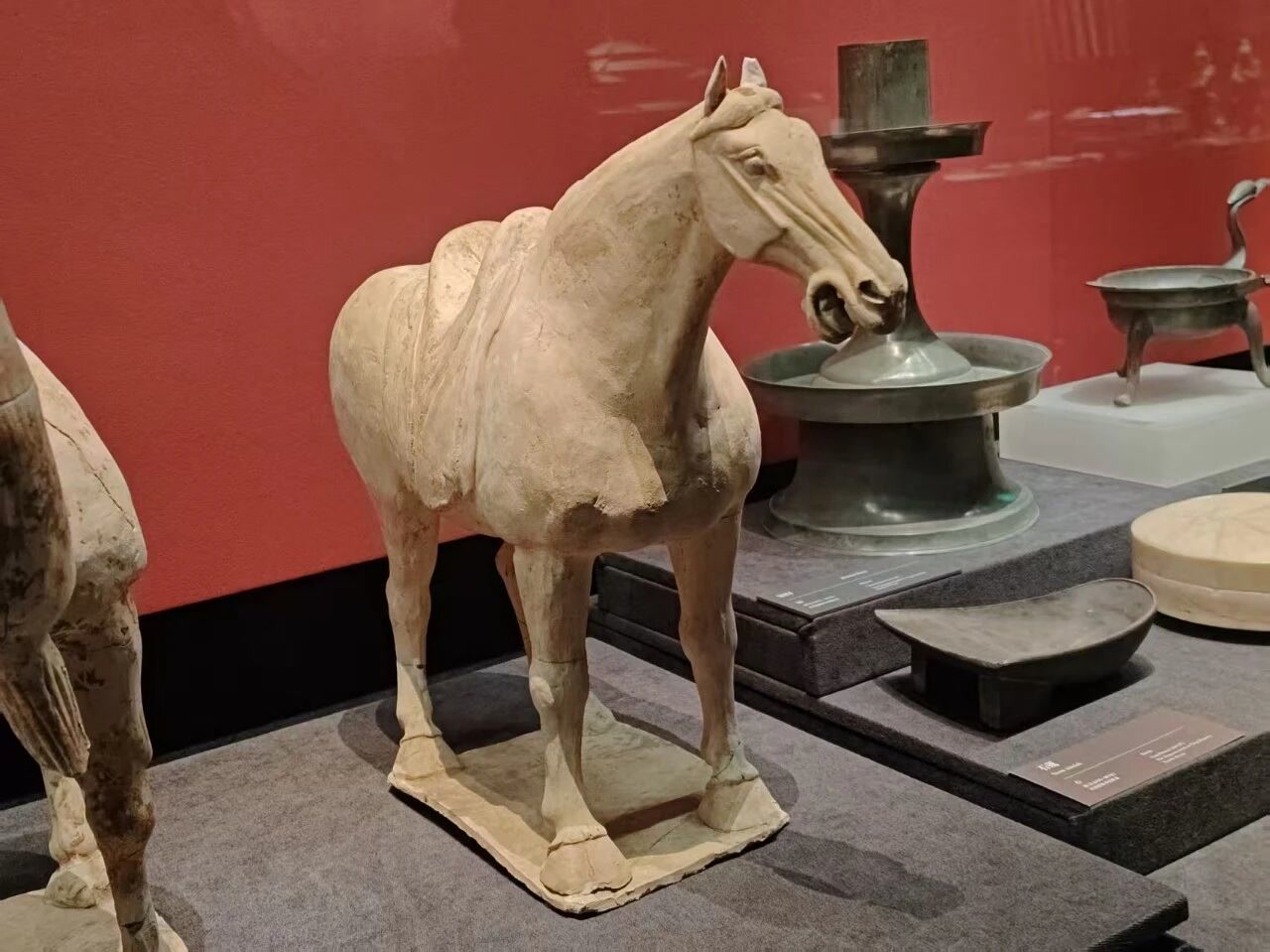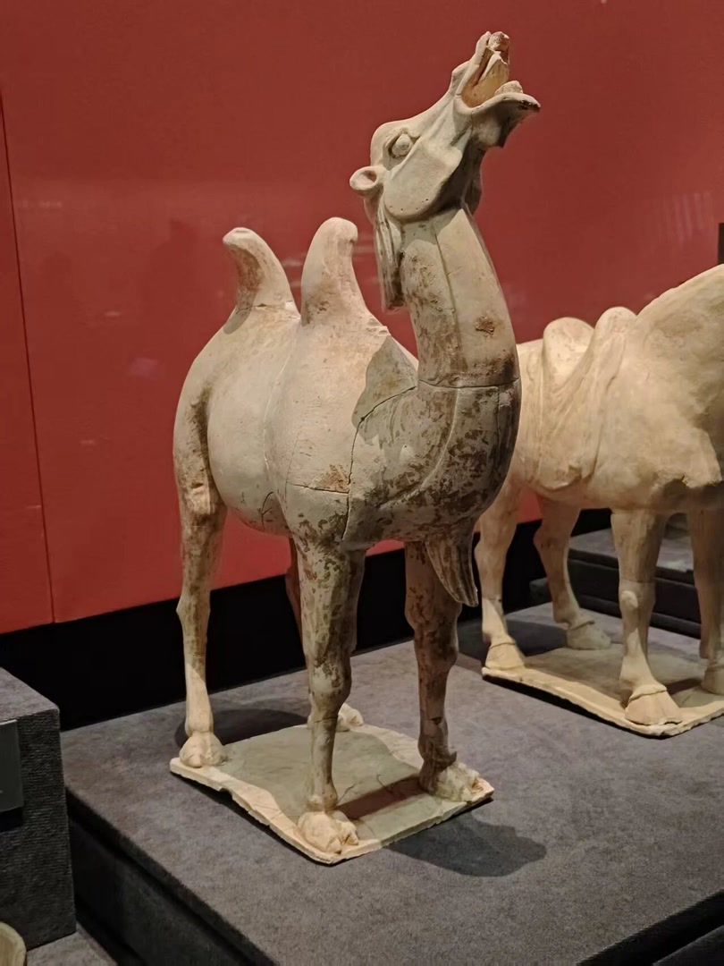骏马形象膘肥体壮,四肢强健有力,颈部微微前倾,眉脊突起,表情动感十足。与这件陶马并列展示的,是同样出土于该墓葬的一件陶骆驼。它高高昂首,小耳后耸,栩栩如生。两件生动的动物陶俑直观反映着千年前唐人的审美意趣。