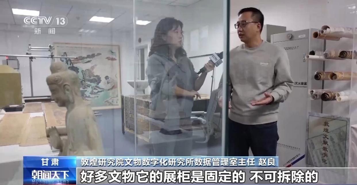 敦煌研究院文物数字化研究所数据管理室主任 赵良:好多文物它的展柜是固定不可拆除的,采集文物的信息就得隔着展柜采集,需要模拟环境,然后测试怎么样的布光方案可以更好地实现采集。