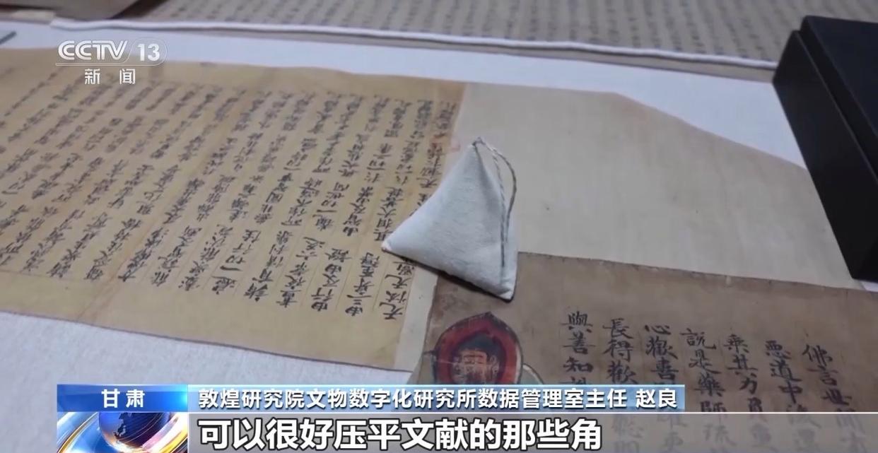 敦煌研究院文物数字化研究所数据管理室主任 赵良:文献有的就是成卷的,有些是比较平整的,那边那个你看就是有非常多的褶皱,像这个小布袋,里面装的是铁珠,大概有50到100克重,可以很好压平文献的那些角。