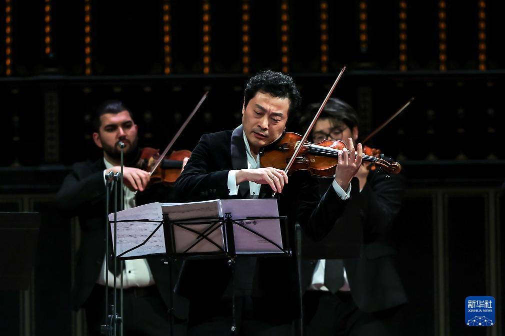 2月2日,在匈牙利首都布达佩斯,中国小提琴演奏家吕思清(中)领衔中匈联合室内乐团在音乐会上演奏。新华社发(鲍洛格·达维德摄)
