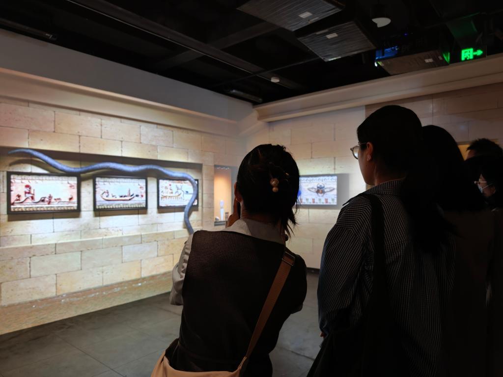 “穿越”至吉萨高地探索金字塔内部、目睹古埃及浮雕中丰收与航行的场景“动”起来、跟随古埃及猫神巴斯特为原型的数字黑猫穿梭于场馆……为了使古老文明更具当代感,展览还引入VR大空间、裸眼3D、AI智能重建等数字技术,让文物“活”起来。