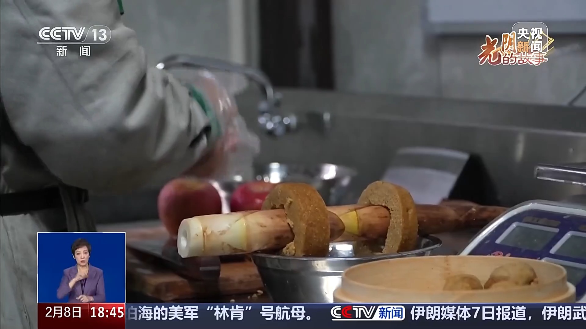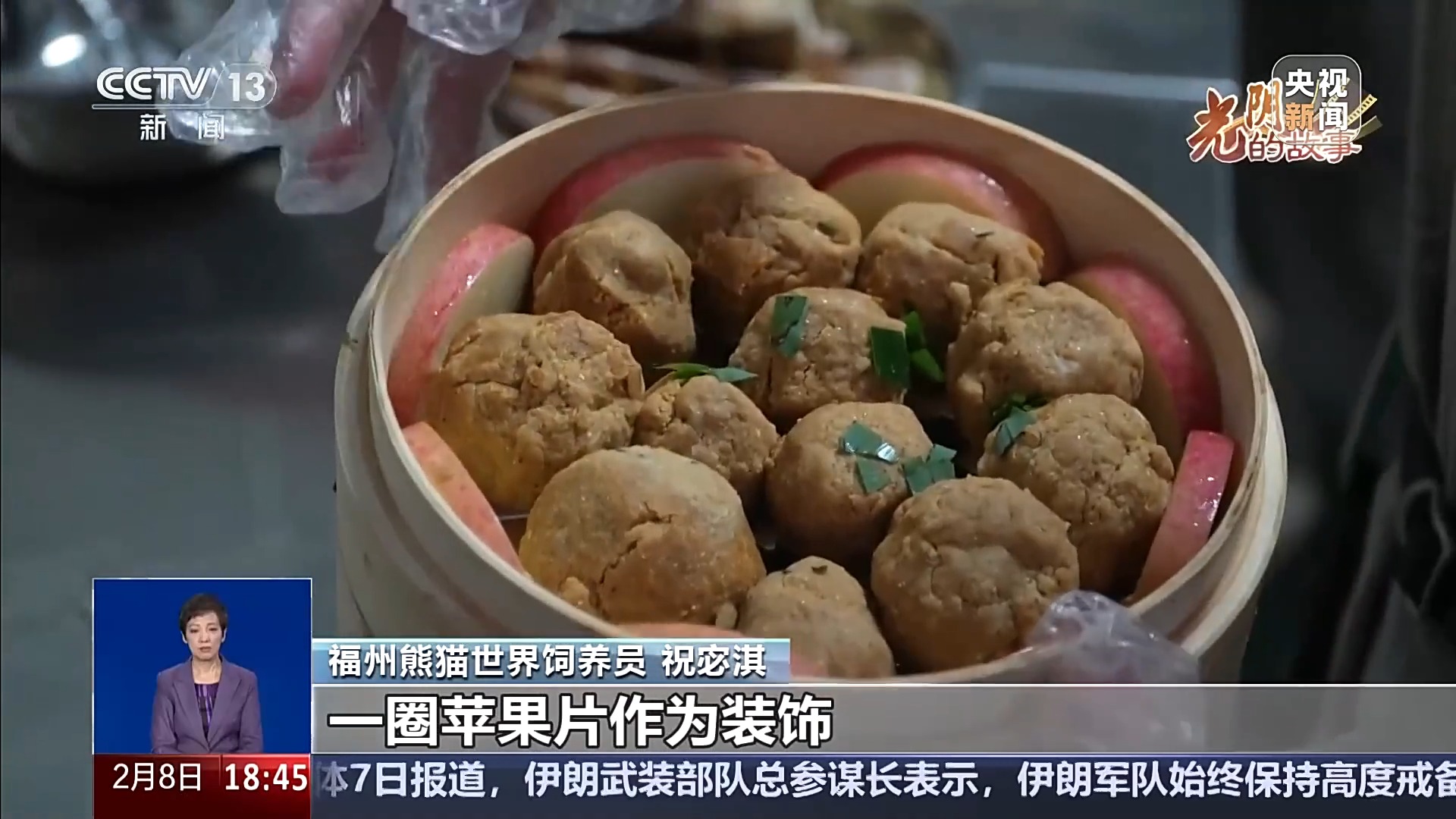 福州熊猫世界饲养员祝宓淇:这是我们给“启航”用窝头捏成的一个鱼丸,我们里面旁边是放了一圈苹果片作为装饰,上面撒了一些竹叶碎,看起来比较像葱花。