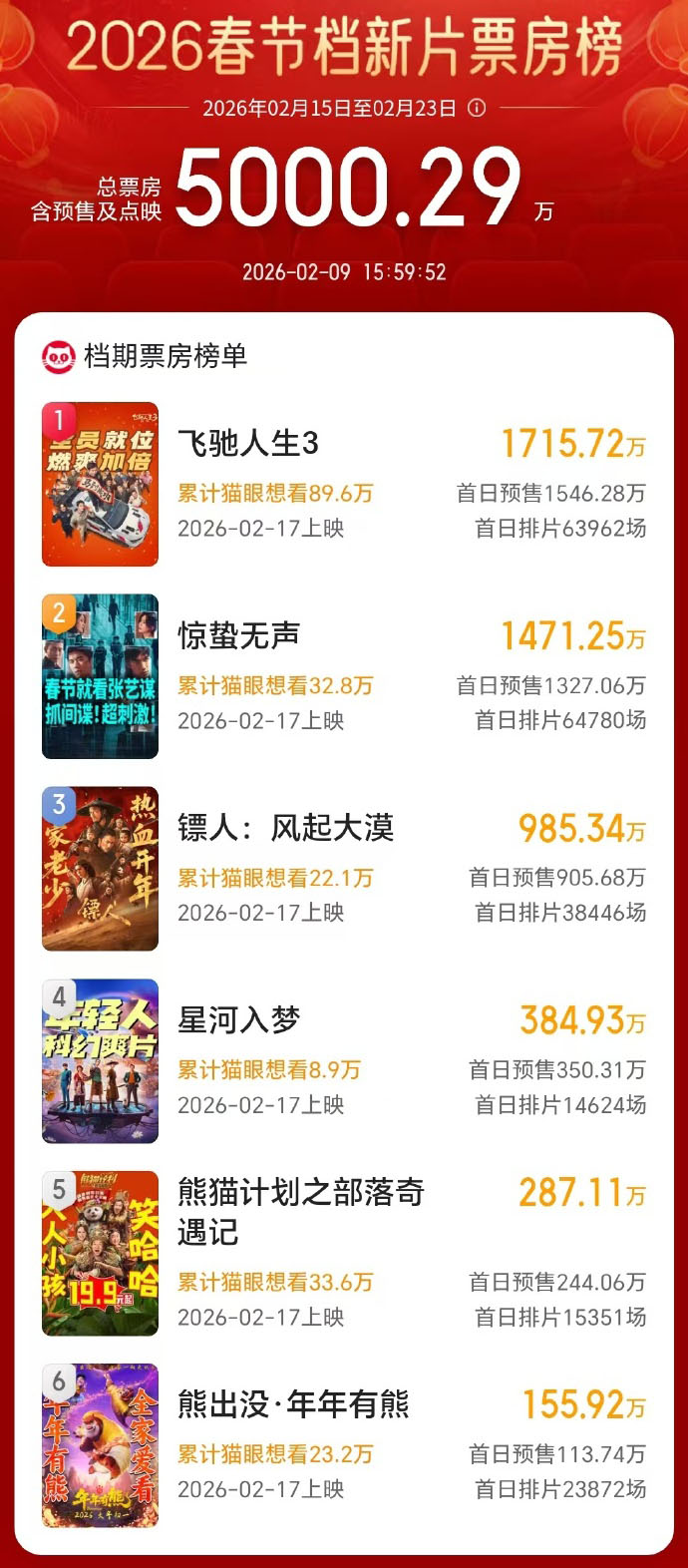 据网络平台数据,2026年春节档新片预售总票房破5000万,《飞驰人生3》《惊蛰无声》《镖人:风起大漠》分列2026年春节档新片预售票房榜前三。