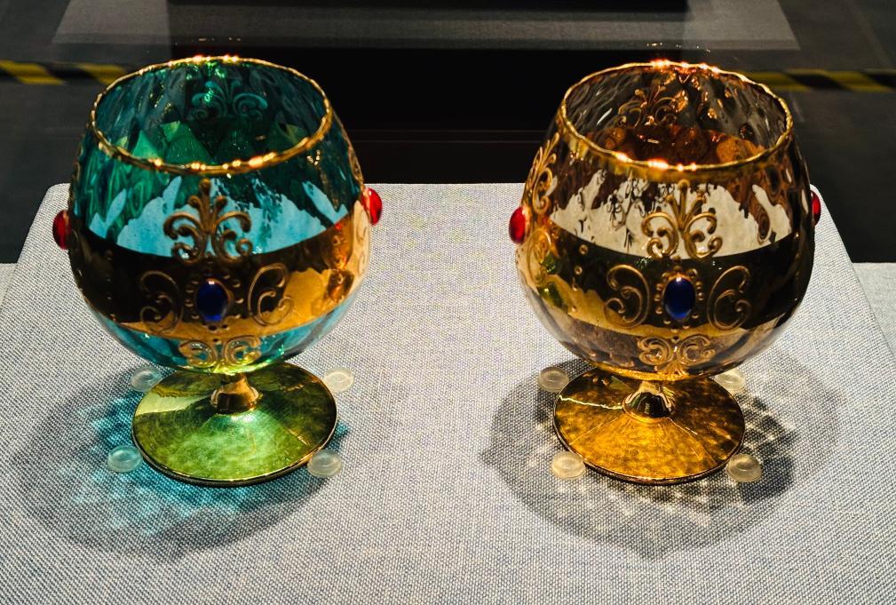 天津博物馆展出的透明蓝色、烟灰色镀金玻璃镶红蓝宝石酒杯(一对)。新华社记者 周润健 摄