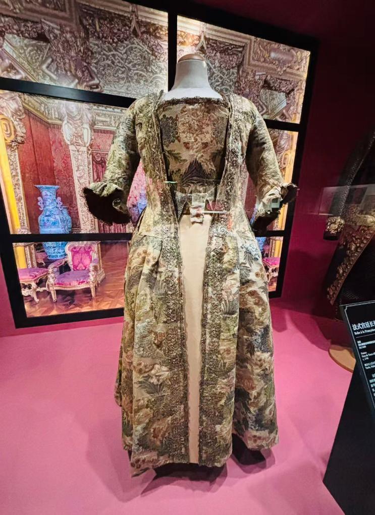 “这件法式宫廷长袍是经典女装款式,其特色在于背部宽大的褶裥设计。据考证,这一服饰的定型设计约在1704年进入时尚界。”天津博物馆器物研究部副主任、策展人李君介绍。