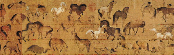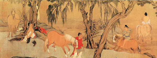 五代时期出现了一批画马高手。他们久居大漠荒原,熟悉那里的一切,以写生的方法创作出了一幅幅精美之作。《卓歇图》是胡坏的力作,“卓歇”是支起帐篷休息之意。该图场景广阔,表现了大漠之中马的漫步、伫立、顾盼、遐思等姿态。