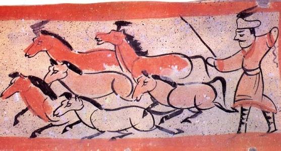 嘉峪关壁画《牧马图》上有六匹疾驰的骏马。在技法表现上,线条洗练、概括,具有强烈的写意味道,是一幅不可多得的上乘之作