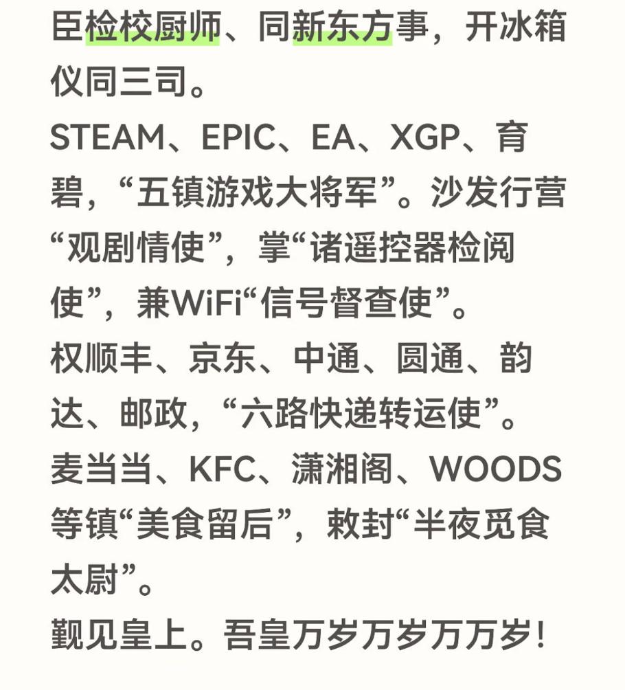 钱弘俶的超长title火了, 网上掀起了“当我用钱弘俶的方式自我介绍”模仿大赛:“臣检校工部设计师,同视觉传达事,Adobe大将军,PS、AI指挥使,掌鼠标键盘显示器督指挥使,权jpg、png、pdf、ppt、word、excel六文件转运使,熬夜上护军,加班改稿大都督,缺觉觉主参见殿下。”评论区有网友接梗:“听口音,乃契丹奸细。”