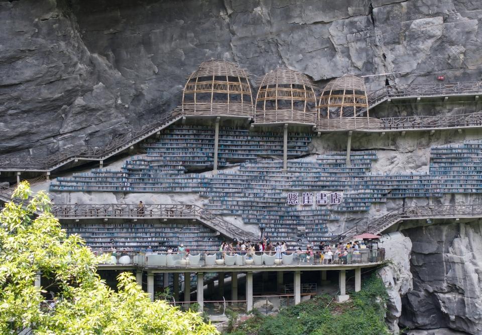 资料图片:2025年8月9日,游客在广西河池市罗城仫佬族自治县棉花天坑景区内的悬崖书店。新华社发(龙涛 摄)