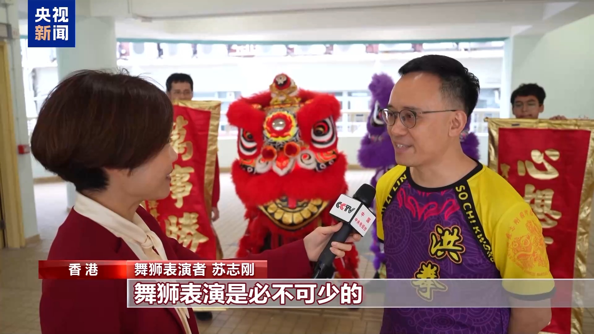 舞狮表演者 苏志刚:我们香港人非常重视春节,每年这个时候都会有很多传统节目。醒狮表演是必不可少的,我们希望借着舞狮表演,让更多人,特别是小朋友感受这项传统文化。