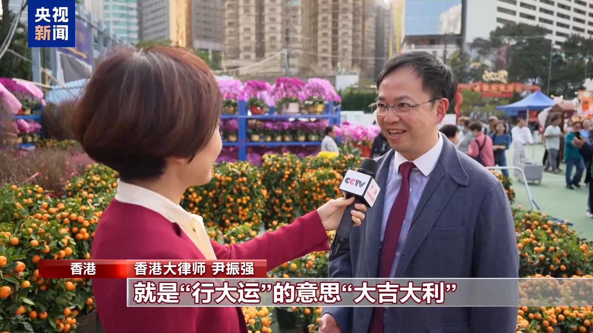 香港大律师 尹振强:逛花街、逛花市,就是“行大运”的意思,“大吉大利”。好多人买花,买金桔在家里摆放。今年是马年,我们祝福国家繁荣昌盛,祝我们香港在“一国两制”之下行稳致远。