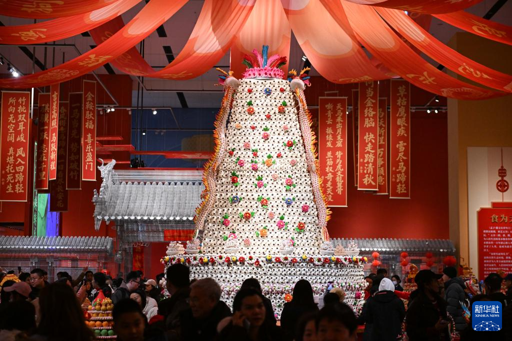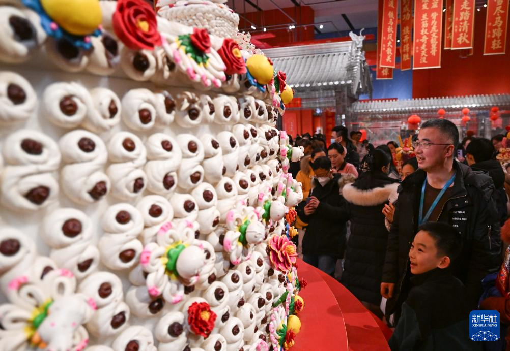 2月15日,观众在“过年——丙午春节系列主题展”上观看陕西非遗代表性项目澄城面花作品“大鼓枣山”。新华社记者 陈钟昊 摄