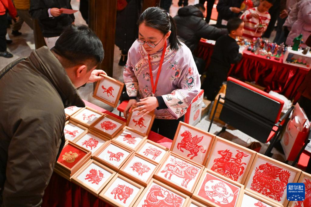 2月15日,观众在“过年——丙午春节系列主题展”上挑选生肖马剪纸作品。新华社记者 陈钟昊 摄