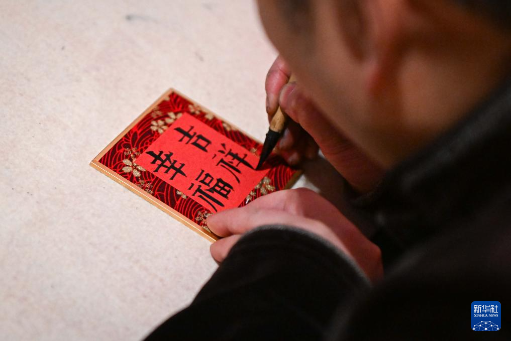 2月15日,在“过年——丙午春节系列主题展”上,工作人员为观众书写祝福语。新华社记者 陈钟昊 摄