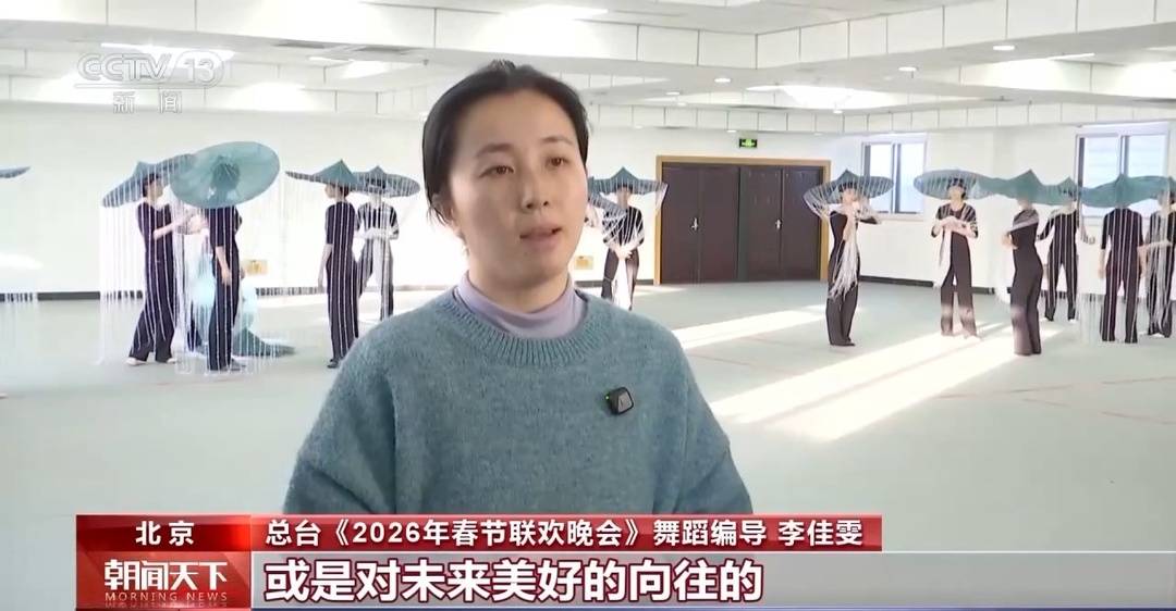 总台《2026年春节联欢晚会》舞蹈编导李佳雯:听雨是属于中国人独有的浪漫,或是在窗檐下听雨,或是画船听雨眠,我们从听可以打开一个小口,可以有无数的想象,听到的是喜悦的心情,听到的是春天的声音。我们在里面找到了一种对春雨落下的时候,少女在春雨下,她或有心事,或是对未来美好的向往,这样一个唯美的画面。